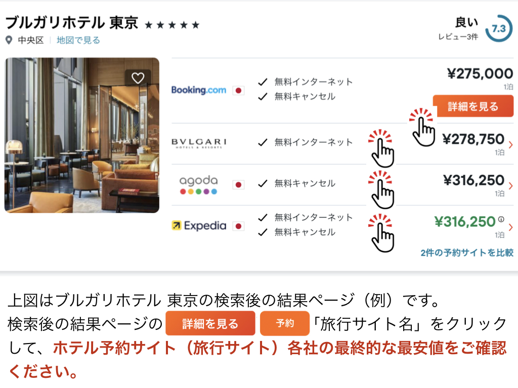 ■「行き先と日付」を入力するだけで簡単に京都のご希望ホテルの最安値がわかります。